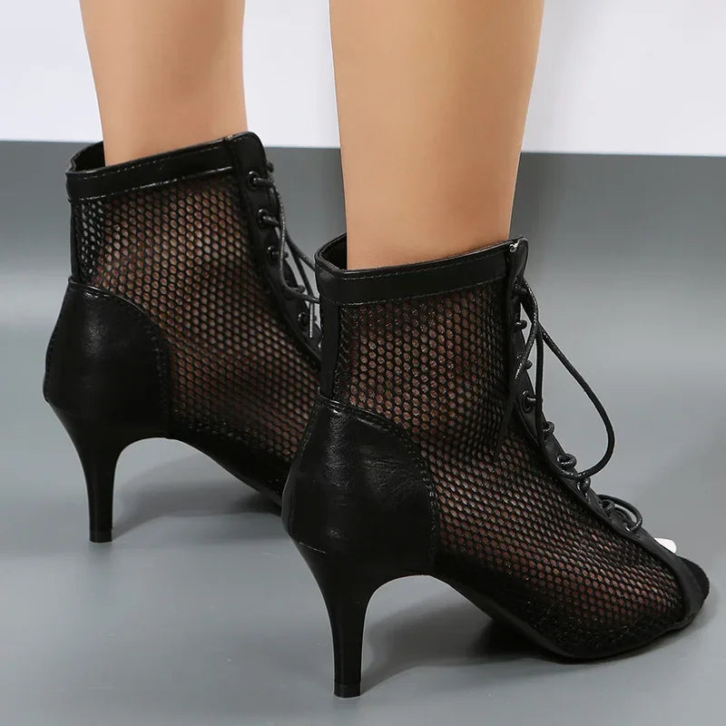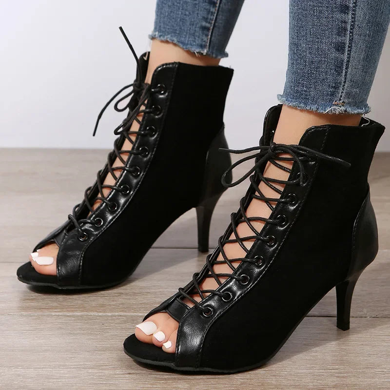 Stylish lace-up high heel sandals with open toe design – perfect for chic summer outfits or evening looks.