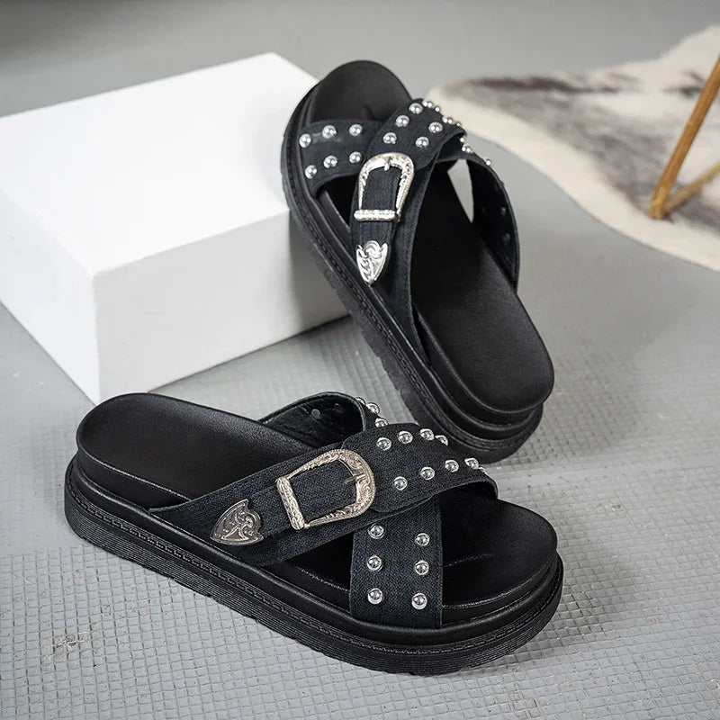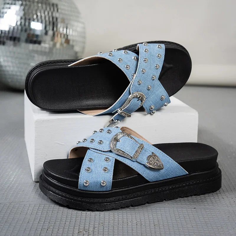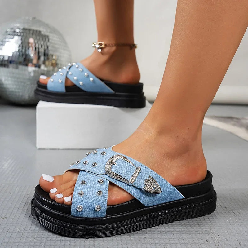 Trendy women’s cross-strap platform slippers with rivet details, combining casual comfort with a fashionable edge. Perfect for summer, vacations, and daily